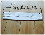 中心に向かって折り、端は少し多めに折りこみます。 アイロンで固定します。 |
