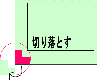 三つ折の場合、角が重なって非常に縫いにくくなりますので 角を図のように落します。折り紙で解りやすく説明します。 |